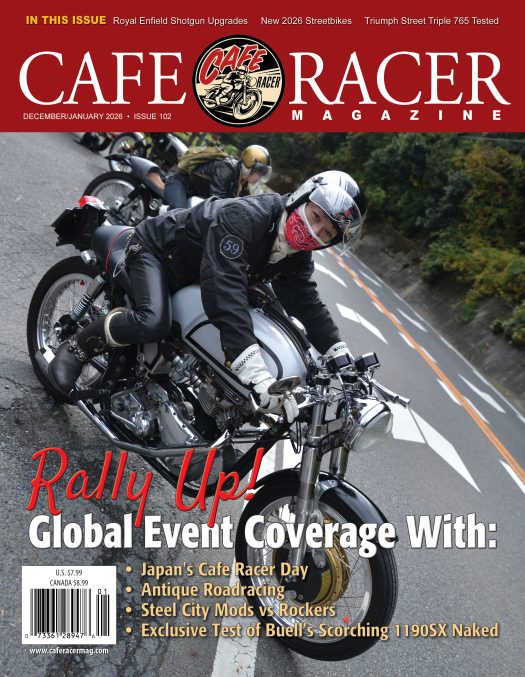 In Cafe Racer magazine’s upcoming December/January issue, we revel in the full-bore enthusiasm for classic British bikes and riding fashions among ton-up riders in Shiga, Japan. Our man on the scene, Hiro Madea, is a longtime vintage Britbike rider and hard-working organizer of motorcycle events in his native country. After spending years as a pattern-cutter at London’s Lewis Leathers, Hiro relocated to Tokyo and began his own Rocker memorabilia line Mode By Rockers, selling handmade leather products and motorcycle badges.